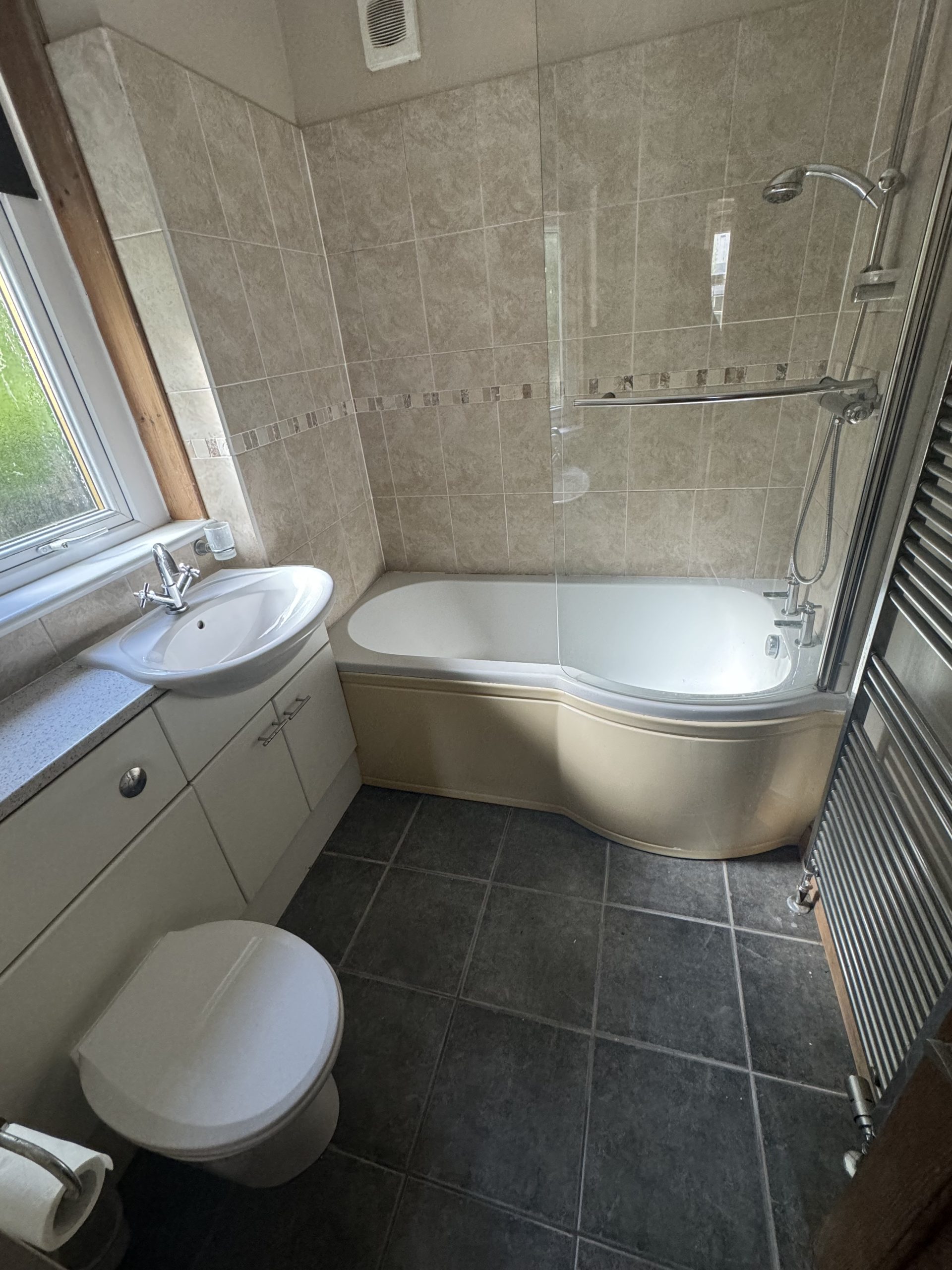 The accommodation comprises: good size living room with gas fire and views to the front of the property; kitchen with integrated gas hob and electric oven, space for fridge/freezer and plumbing for washing machine; both bedrooms are double rooms with views to the rear of the property; bathroom with W.C., washhand basin and shower over bath. The flat is allocated the garden to the front of the property and a strip of ground at the back which are both laid to lawn.