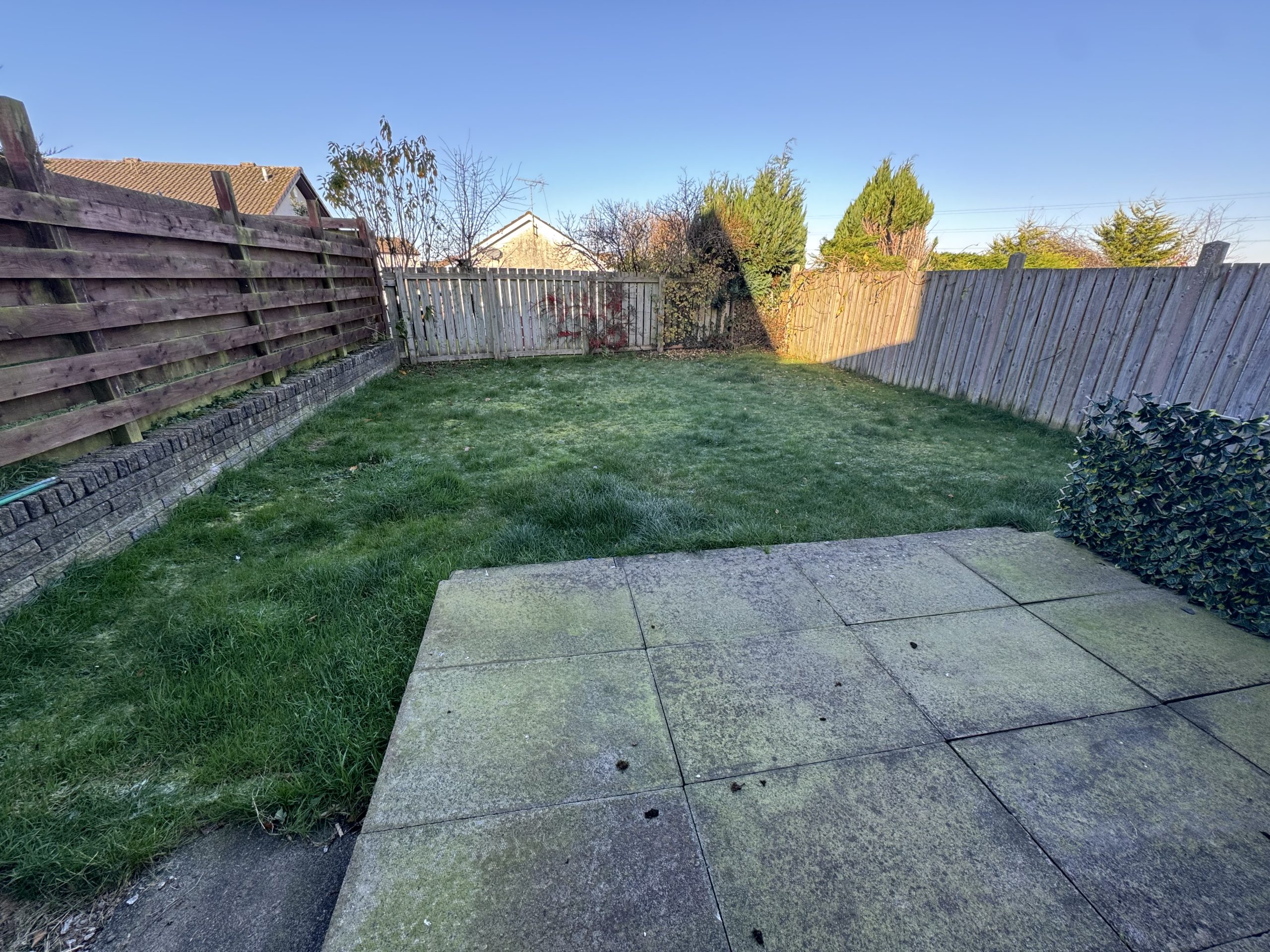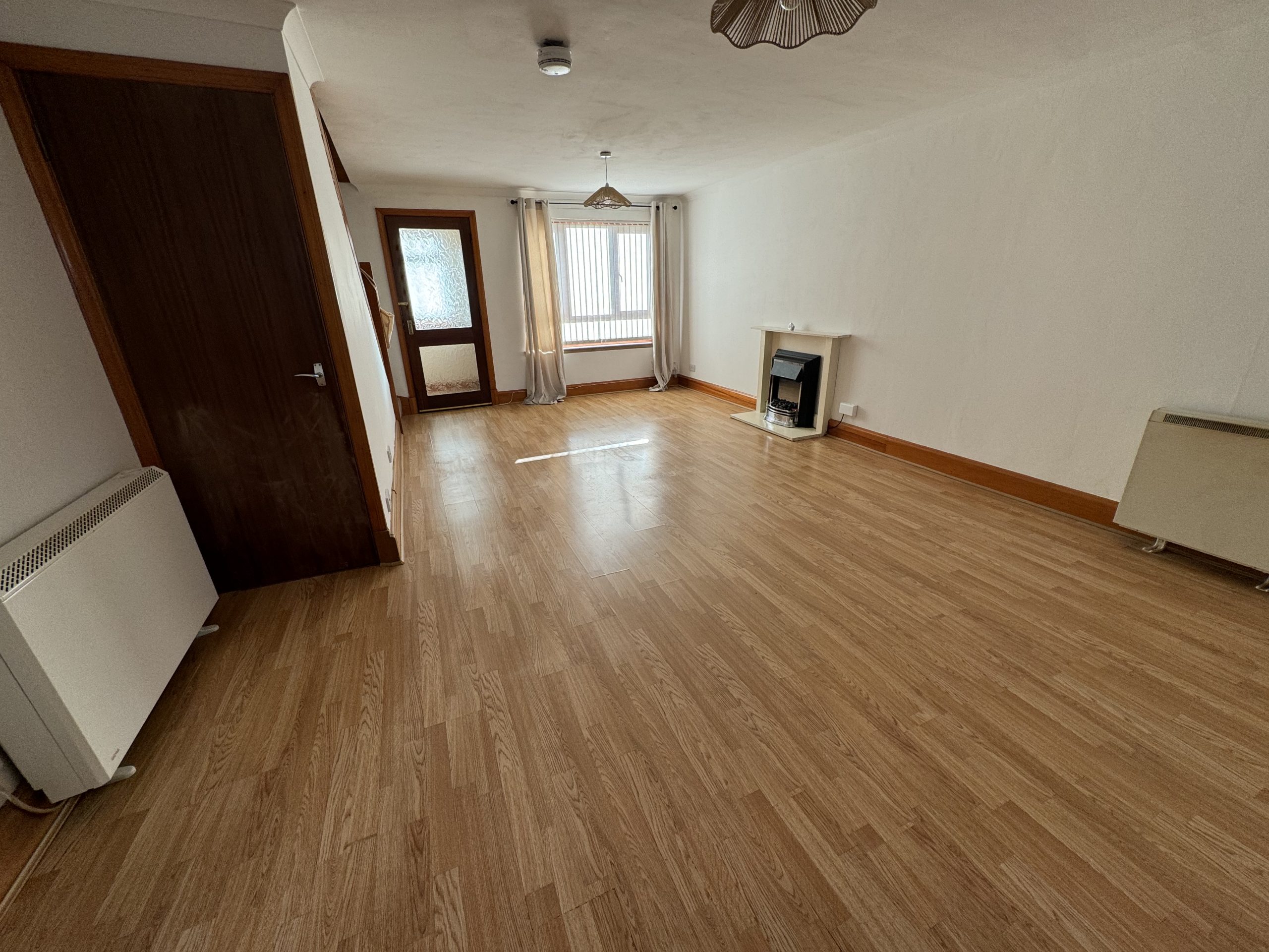 The accommodation comprises: entrance vestibule with storage cupboard; spacious living room with electric fire and surround and two electric storage heaters, under-stairs cupboard and window to the front of the property; kitchen with floor and wall cupboards, integrated fridge/freezer, electric grill/oven, hob and breakfast bar and electric storage heater; utility room with floor and wall cupboards, space and plumbing for washing machine and electric storage heater; bedroom 1 is a double room to the front of the property with single storage cupboard; bedroom 2 is a double room to the rear of the property; family bathroom with W.C., washhand basin and shower over bath. The garden to the front of the property is laid to lawn with paved driveway and the garden to the rear of the property is laid to lawn with paved seating area.